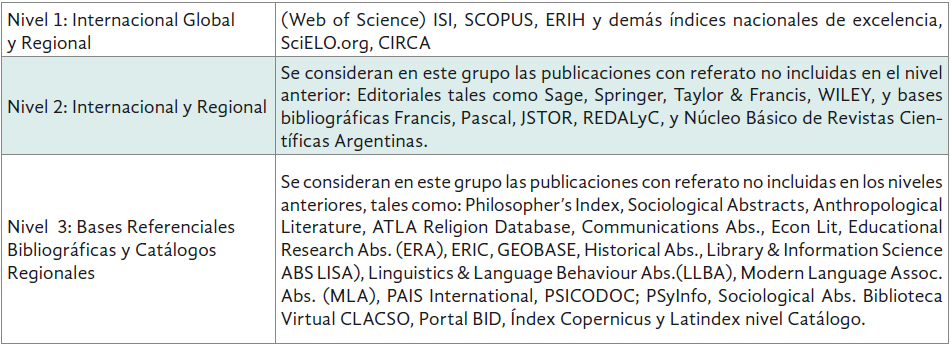 El Directorio del CONICET analizó las recomendaciones de la Comisión de Expertos en CSH (Res. D3592/13 y D311/14) convocada ad hoc y expone unos principios generales para la jerarquización orientativa de bases de datos de indización en tres niveles, que no implican una valoración o ponderación puntual de cada revista ni de sus artículos, sostienen que criterios bibliométricos, como factor de impacto (FI), no serán criterios para evaluar la calidad de las revistas en CSH, que para que un artículo sea considerado científico deberá estar publicado en una revista con arbitraje (evaluación de pares externos) expreso y con un comité editorial de prestigio; que los tres niveles de jerarquización que se establecen son una meta de calidad y repercusión de las publicaciones; que la jerarquización de los índices de publicaciones científicas no implica que una revista reciba un puntaje por pertenecer a un nivel o grupo determinado. Se señala que dentro de un mismo nivel o grupo se encuentran revistas que difieren entre sí respecto de su calidad; que los criterios de clasificación serán públicos y claros y de fácil acceso en los sistemas de información de CONICET, que el seguimiento y actualización de las bases de indización será implementado por el Centro Argentino de Información Científica y Tecnológica (CAICYT).