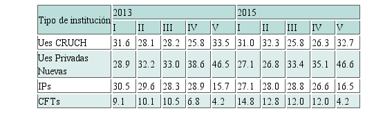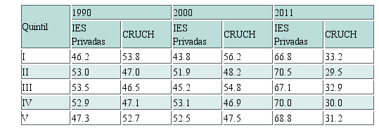 En el Cuadro 2, que recoge la distribución de estudiantes matriculados en educación superior por quintil de ingreso, se aprecia que, en general, para todos los quintiles al año 1990 la matrícula se repartía en mitades entre las instituciones privadas (incluyendo a universidades, Institutos Profesionales (IPs) y Centros de Formación Técnica (CFTs) y las universidades del Consejo de Rectores de las Universidades Chilenas (CRUCH). Dos décadas después la proporción privada se ha incrementado notablemente, siendo la participación de la matrícula en las entidades privadas superior a los dos tercios de la población estudiantil para todos los quintiles de ingresos, mientras que las entidades del CRUCH solo reclutan alrededor de un tercio de dicha población. Una posible explicación de este fenómeno es la creación del Crédito con Aval del Estado (CAE) que extendió el crédito para los estudiantes de las instituciones privadas (incluyendo CFTs e IPs) a contar del año 2006. Esta tendencia se ha incrementado aún más con posterioridad al año 2011 debido a que los movimientos estudiantiles de ese año lograron que se igualara la tasa de interés del CAE para las entidades públicas y privadas en un 2%. Para 2013 solo un 27% del total del estudiantado de nivel terciario estaba en las universidades del CRUCH, mientras que el 31% estaba en universidades privadas y 42% en los IPs y CFTs. Se podría sostener que el CAE influyó para alcanzar una distribución más equitativa del estudiantado al interior del SES pero no así para el acceso a una educación de calidad donde concurren preferentemente estudiantes provenientes de los quintiles más ricos.
