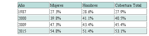 Los datos revelan que en el periodo 1987-2015 se produjo un incremento notable de la cobertura bruta en ES que casi logra duplicarse. Al desagregar las cifras por género se constata que la cobertura tanto a nivel femenino como masculino se ha incrementado significativamente en las últimas décadas con un leve predominio de la participación de mujeres en el sistema a contar del año 2009, tendencia igualmente observable a nivel de América Latina (Ver Cuadro 10).