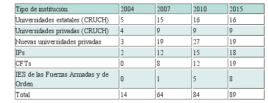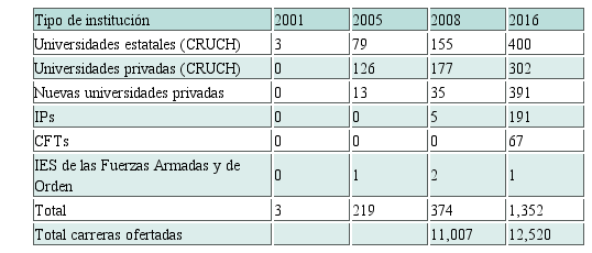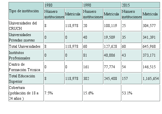 Los procesos de masificación y privatización promovidos desde comienzos de los años 80 bajo la dictadura de Pinochet y continuados por los gobiernos democráticos liderados por la Concertación de Partidos por la Democracia a contar de 1990 han contribuido por cierto a gestar un aumento significativo en la cobertura tanto a nivel de universidades, institutos profesionales y centros de formación técnica.