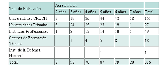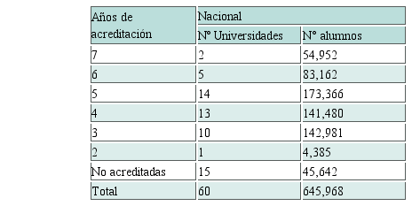 Las universidades de mayor renombre (con 6 y 7 años de acreditación institucional) pertenecen al grupo de universidades del CRUCH (entidades tradicionales) y son aquellas denominadas complejas por desarrollar actividades de docencia, investigación y extensión. Ostentan una alta productividad científica. En cambio, las universidades que poseen entre 3 y 5 años de acreditación, por lo general, desarrollan actividades docentes de manera preferente y en un grado menor, en algunos casos, conducen proyectos de investigación y mantienen una actividad constante con la comunidad.