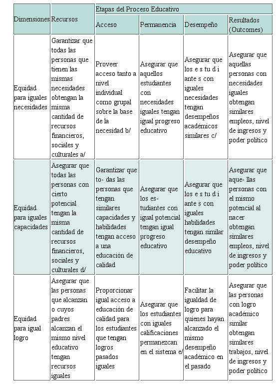 Para este trabajo, se conceptualiza el término equidad a partir del modelo teórico de igualdad y equidad de Espinoza (2002, 2007, 2014). En esa perspectiva, el modelo desarrollado aquí sugiere varias nuevas direcciones para el análisis y la investigación. En efecto, el modelo considera dos ejes de análisis. Por una parte, los conceptos de igualdad y equidad en sus diferentes dimensiones, y por otra, los recursos (financieros, sociales y culturales) y los distintos estadios del proceso educativo (acceso, permanencia, desempeño y resultados). A partir del cruce de los ejes señalados se generan diversas celdas, cada una de las cuales constituye una meta, ya sea orientada a la búsqueda de la igualdad o de la equidad en sus distintas dimensiones (ver Cuadro 3). Para efectos de este capítulo, sólo se considera lo atingente a la equidad. En relación a este eje de análisis el modelo multidimensional reconoce tres dimensiones.