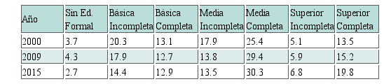 El acceso a la educación terciaria supone el cumplimiento o logro de distintas etapas previas en el proceso educativo. En ese contexto, resulta interesante constatar que entre la población mayor de 25 años alrededor del 30% pudo completar su enseñanza secundaria durante el año 2015, en tanto que alrededor del 20% hizo lo propio con estudios de educación superior. Es decir, uno de cada cinco individuos mayores de 25 años logró concluir los estudios en el nivel postsecundario en 2015, mientras que dicha relación era de 1 por cada 7 individuos en el año 2000 (Ver Cuadro 4).