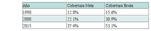 Para comprender el impacto que ha tenido el proceso de masificación y privatización de la educación superior en Chile no puede desconocerse un indicador como el de la cobertura bruta y neta en la población comprendida entre los 18 y 24 años. En esa línea los datos consignados en el Cuadro 6 dejan en evidencia que tanto la cobertura neta como la bruta han experimentado un crecimiento notable en el periodo 1990-2015, pasando de 12,8% a 37,4%, en el primer caso, y de 15,6% a 53,1% en el segundo caso. Para ambos indicadores se aprecia un incremento de cobertura superior al 300% en un lapso de 25 años (Ver Cuadro 6).