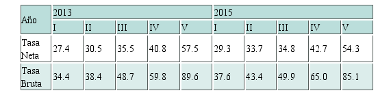 Ahora bien, si el análisis se circunscribe a evaluar lo que ha ocurrido con la cobertura tomando como referencia el nivel de ingresos familiares según quintiles se puede concluir que al comparar el año 2015 con el 2013 la cobertura bruta tuvo un incremento en los primeros tres quintiles mientras que lo contrario se produjo con los quintiles IV y V. En cambio, en el plano de la cobertura neta se observa un aumento en los quintiles I, II y IV para el año 2015, mientras que los quintiles III y V evidenciaron una leve caída en comparación con el año 2013 (Ver Cuadro 8).
