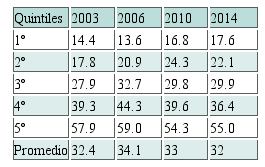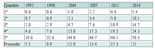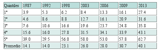 Si observamos la evolución de la participación de los quintiles de ingresos socioeconómicos más bajos en la educación superior, es importante su ampliación hasta alcanzar la escolarización del 27% de los pertenecientes al primer quintil (Cuadro 5); han mejorado también los indicadores de logro educativo aunque todavía la brecha entre el quintil inferior y el superior resulta significativa (Cuadro 6).