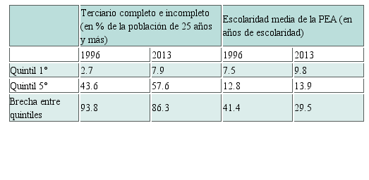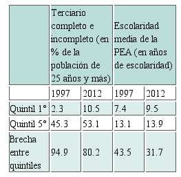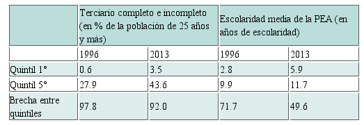Los diversos gobiernos que se sucedieron en estas tres décadas encararon un movimiento de ampliación de las oportunidades de ritmo lento, con primacía de la vía privada y gradualidad extrema hasta la llegada de los gobiernos del PT. Estos últimos generaron una amplia reforma del tercer nivel en el que tibiamente crece la oferta pública mientras sigue expandiéndose -aunque a un ritmo menor- la privada. Esto se ha traducido en una ampliación de la participación en la educación superior de los quintiles más bajos la cual, si bien ha crecido en los últimos quince años, aún permanece en valores reducidos (Cuadro 3). Esto aún no se ha traducido en un mejoramiento significativo de los logros educativos de esos grupos (Cuadro 4).