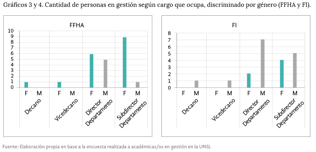 A su vez esta última representación se encuentra permeada por la emergencia mediática y social de la problemática de género en la sociedad argentina, en otros términos, las disputas en el campo del género son siempre y antes que nada representaciones del poder, de la relación de lo público y lo privado y los roles adjudicados de manera diferencial. Las expresiones de sentido dan cuenta de una paridad de personas en cargos de gestión de ambas facultades de la UNSJ que consideran al género asociado exclusivamente a lo femenino.