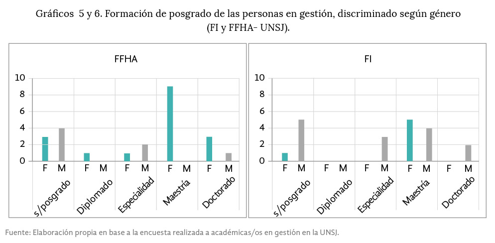 Por otro lado, es importante destacar que en repetidas ocasiones la formación académica aparece a nivel de lo discursivo como un catalizador en el acceso a cargos de gestión académica. En el caso de la FI y FFHA el género emergió como un determinante de mayor peso ya que si bien existe una mayor cantidad de mujeres con formación de posgrado estas acceden a cargos de menor jerarquía.