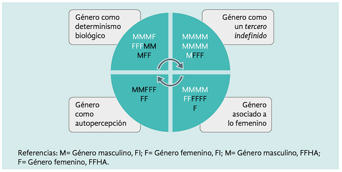 Es importante señalar que el esquema de categorías representa una herramienta analítica, un modelo para comprender las heterogeneidades presentes a la hora de conceptualizar el género. Las diversas miradas se presentan en lo cotidiano de manera compleja y relacional, donde los saberes propiamente científicos y del sentido común convergen para generar una definición que en primera instancia parece compartida por todos/as pero que cuando se profundiza, aparece difusa y conflictiva.