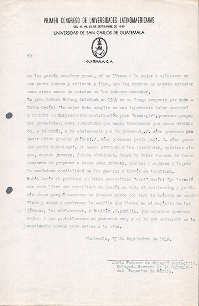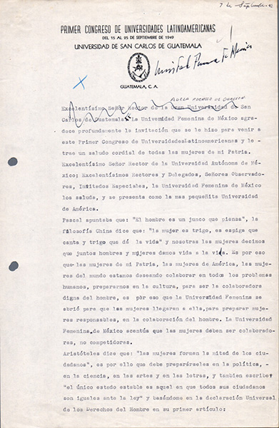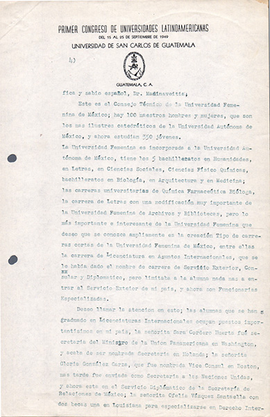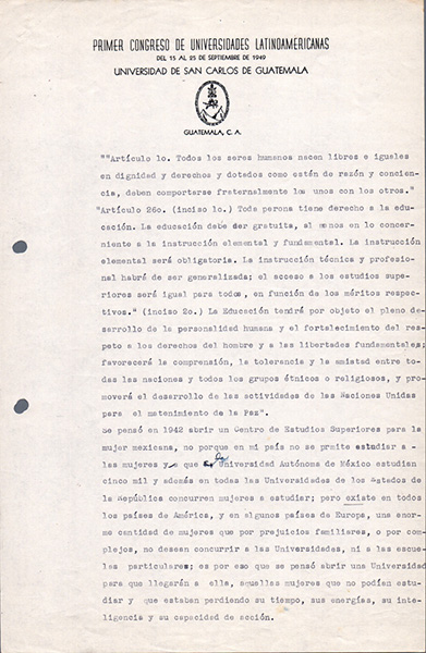 Hace casi 70 años, en 1949, hubo una mujer que se paró frente a una sala llena de hombres a compartir sus palabras para presentar su universidad y sobre todo el porqué de la creación de la misma. Se trataba de Adela Formoso de Obregón Santacilia, quien durante el Primer Congreso de Universidades Latinoamericanas en la Universidad de San Carlos de Guatemala, cuando se fundó la Unión de Universidades de América Latina y el Caribe, UDUAL, leyó un discurso que puede ojearse hoy y mantener su actualidad (siempre teniendo en cuenta ciertos anacronismos respecto de los estudios de género1, tan recientes, aún hoy en este 2018).