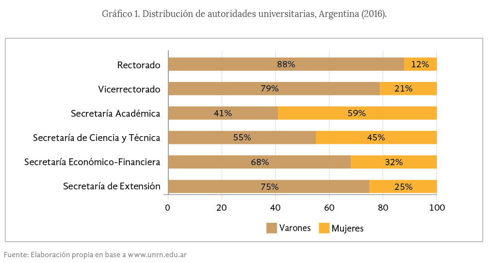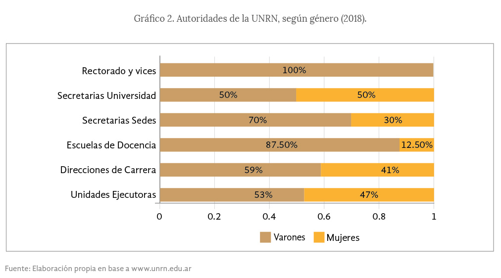 El escenario de la educación superior no es diferente. En la región, según la Organización Universitaria Interamericana (OUI), el 14% de los rectores de las universidades latinoamericanas son mujeres. En el caso de Argentina: de todas las universidades e institutos universitarios que componen el Consejo Interuniversitario Nacional (CIN) el 89% de los rectores son varones, sólo 6 rectoras de 55 instituciones. Tampoco la Universidad Nacional de Río Negro (UNRN) es una excepción a un cuadro general de desigualdad de género (Rulli, Peter y Robles, 2016).