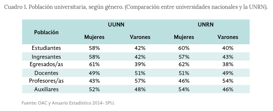 En los datos sobre la población global según género de la UNRN se pueden observar los mismos parámetros en comparación con el resto de las universidades nacionales argentinas. En los datos presentados en el Cuadro 1, se visualiza que salvo en el caso de los profesores, en todas las otras categorías de población universitaria hay un mayor porcentaje de mujeres.