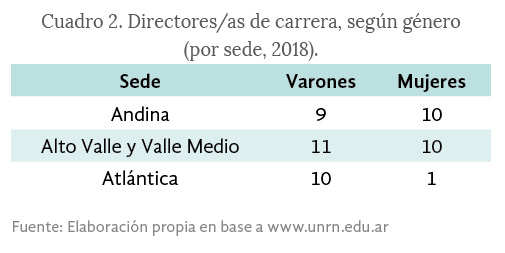 En el caso de las direcciones de las carreras (licenciaturas, ciclos de complementación y tecnicaturas), mientras en las sedes Andina y Alto Valle y Valle Medio hay un escenario de paridad, en la Atlántica de once direcciones una está ocupada por una mujer (Cuadro 2).