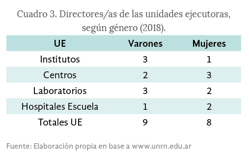 Tal como se observa en el Cuadro 3, en el caso de las unidades ejecutoras de investigación: los centros y laboratorios presentan un escenario casi de paridad en sus autoridades, mientras que en el caso de los institutos se observan tres varones de cuatro en total.