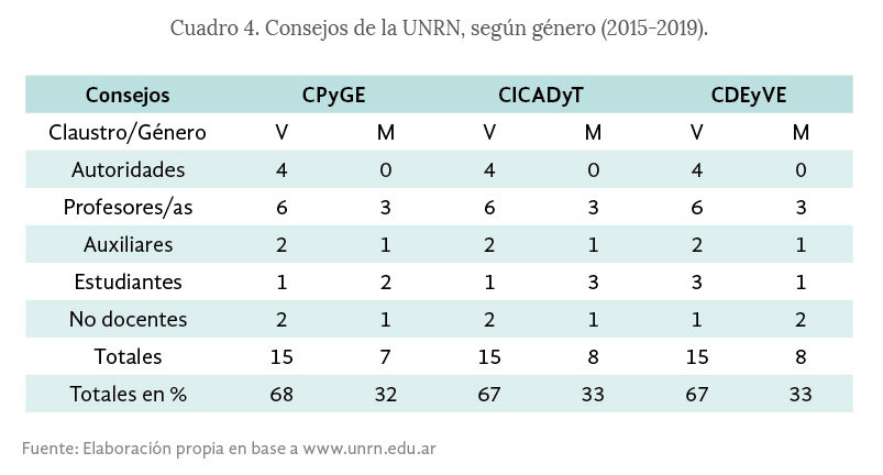 Tal como se mencionó anteriormente, la UNRN cuenta con tres consejos de gobierno: el Consejo de Programación y Gestión Estratégica con el 68% de varones y el 32% de mujeres y los Consejos de Investigación, Creación Artística, Desarrollo y Transferencia de Tecnología y de Docencia, Extensión y Vida Estudiantil el 67% de varones y 33% de mujeres (Cuadro 4).