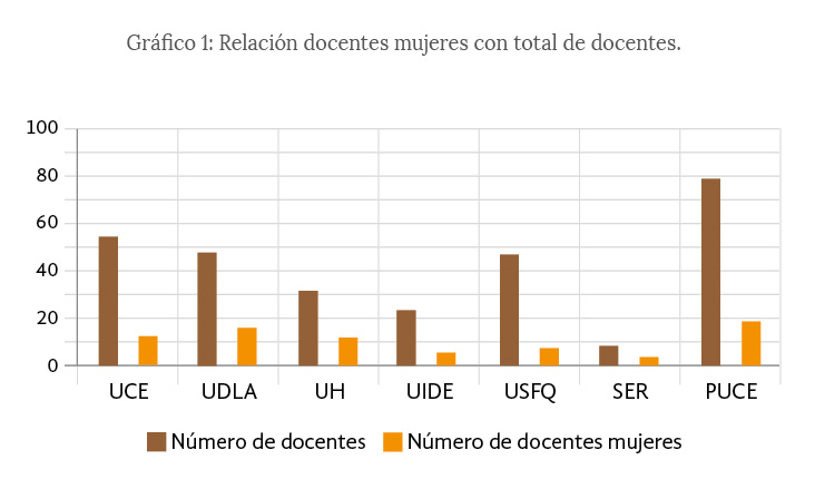 En el Gráfico 1 se puede observar que no existe paridad entre los/as docentes. Los porcentajes de mujeres en relación a la totalidad de la planta de docentes alcanza cifras preocupantes salvo en el caso de la Universidad SEK en donde casi se alcanza la paridad (las mujeres representan en 44,4% de la totalidad de docentes). Le sigue la facultad de Derecho de la UDLA con el 33.3% de la planta.