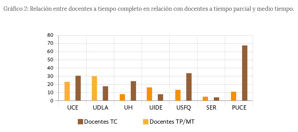 En lo que respecta a la dedicación de tiempo a la docencia en la facultad, el Gráfico 2 presenta la relación entre docentes a tiempo completo y docentes medio tiempo o tiempo parcial. Como se puede observar, persiste una presencia mayoritariamente masculina, excepto en la UDLA.