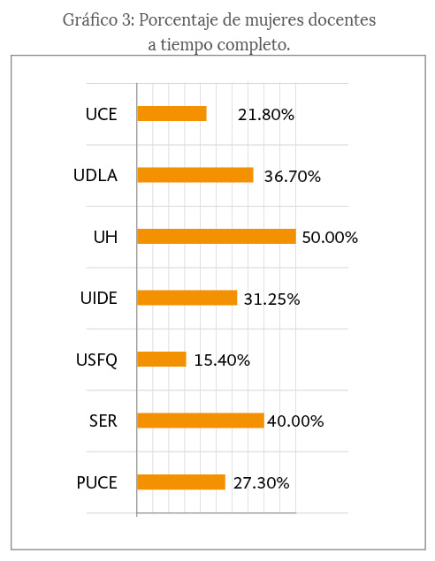 En los Gráficos 3 y 4, se puede observar la relación entre el número de docentes tiempo completo mujeres y la totalidad de docentes a tiempo completo. Como se evidencia en el Gráfico 3, la paridad entre docentes mujeres y hombres bajo la modalidad de tiempo completo sólo se alcanza en una de las universidades: la UH. La más baja es la USFQ con una planta docente a tiempo completo de la cual sólo el 15.4% son mujeres. El resto de facultades oscila entre el 20% y el 40% de mujeres docentes en esta modalidad de tiempo de dedicación.