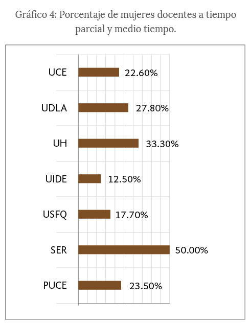 En lo que respecta a las docentes a tiempo parcial o medio tiempo, la situación no cambia. La paridad es alcanzada solamente en la Universidad SEK. En el resto de las facultades, el porcentaje de mujeres docentes en esta modalidad no alcanza el 40% y llega hasta valores tan bajos como el 12.5% en la UIDE. La variación (en porcentaje) en relación con la modalidad a tiempo completo es mínima. Se puede afirmar que la modalidad de contratación no influye sustancialmente en el aumento en la representación de las mujeres.