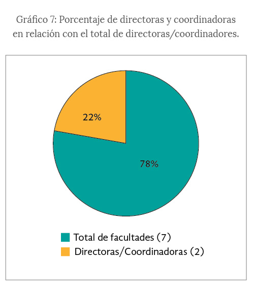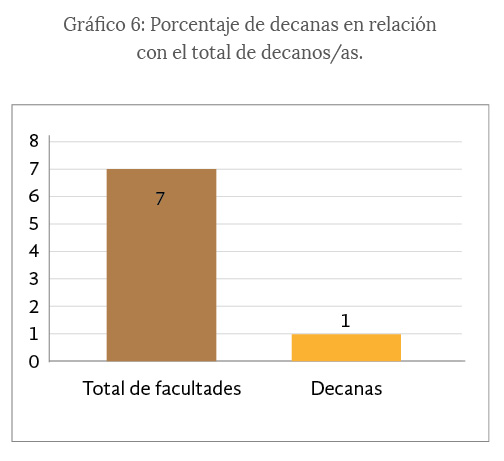 Otro tema importante al analizar la presencia de las mujeres en las facultades de Derecho es su representación en puestos de decisión. Como lo mencionan Castro y Paredes, “los hombres dirigen y las mujeres apoyan” (Castro & Paredes, 2015: 119, 122), demostrando que su liderazgo aún no está posicionado en el ámbito académico (Buquet et al., 2013: 75; Palomar Verea, 2005: 13; The World Bank Group, 2014: 25; UNESCO, 2012: 85).