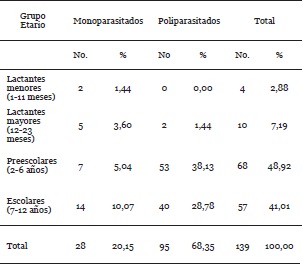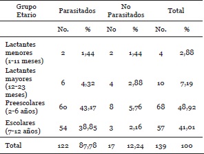 La Tabla 1 presenta la prevalencia de enteroparásitos por grupo etario, donde las edades 1 a 11 meses, presentaron 2 casos que correspondieron al 1,44%, seguido del grupo de 12 a 23 meses, con 6 infantes parasitados, que constituyó un 4,32%. Mientras que en los infantes de 2 a 6 años se encontraron 60 niños parasitados, lo que correspondió a un 43,17% siendo este el grupo con el mayor porcentaje de enteroparásitos. Por último, los niños de 7-12 años, con 54 casos, correspondientes al 38,85%. El análisis estadístico demostró ser significativo (c2 = 16,72 p< 0,05) es decir, existe dependencia entre las variables estudiadas.