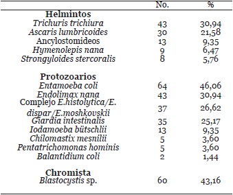 Del total de individuos estudiados (n= 139), se encontraron 122 parasitados, lo que representa una prevalencia general de enteroparásitos de 87,70 %.