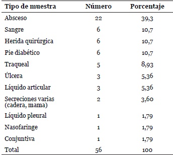 En la presente investigación fueron diversos los tipos de muestras a partir de las cuales se aislaron las cepas SAOR, siendo los cultivos de abscesos (22 cepas/39,3%), hemocultivos (6 cepas/10,7%), heridas quirúrgicas (6 cepas/10,7%) y pie diabético (6 cepas/10,3%) las más frecuentes (ver Tabla 1).