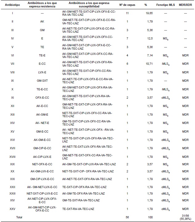 Con respecto a los patrones de resistencia a los antibióticos observados en las cepas de SAOR (Tabla 2), se presentaron 25 antibiotipos diferentes, siendo el mayor porcentaje de los aislamientos sólo resistentes a oxacilina con susceptibilidad al resto de las clases de antibióticos, seguido de resistencia sólo a eritromicina (fenotipo MSB) y sólo resistencia a eritromicina y clindamicina (fenotipo iMLSB). El 55,36% de los aislamientos fueron multidrogo- resistentes. No se observó extensa resistencia a los antibióticos ni pandrogo-resistencia.