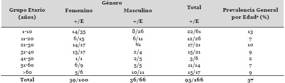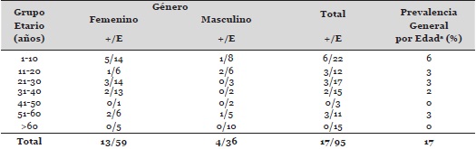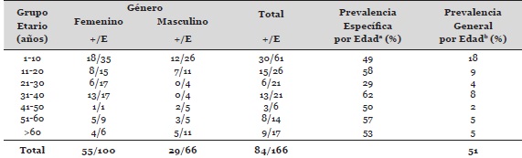 En la Tabla 3 se presenta el porcentaje de positividad para anticuerpos IgG anti-T. gondii según los diferentes grupos etarios y sexo. Se detectaron 95 casos seropositivos, 59 femeninos y 36 masculinos, para una prevalencia general de 57%. La infección resultó ser mayor en los niños menores de 10 años y en etapas reproductivas (21 a 40 años); sin embargo, las diferencias en cuanto a género y grupo etario no fueron estadísticamente significativas.