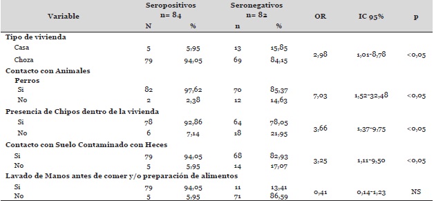 La relación existente entre la infección por T. cruzi y los diversos factores de riesgo analizados se aprecia en la Tabla 2, se evidencia que la mayor prevalencia estuvo presente en aquellas personas que refirieron habitar en viviendas tipo choza (94,05%), los individuos que tenían contacto con perros (97,62%), la presencia de chipos dentro de la vivienda (92,86%) y suelo contaminado con heces (94,05%) de los animales que se encontraban en el peridomicilio (perros, gatos, gallinas, entre otros), todos estos factores mostraron tener diferencias estadísticamente significativa, mientras que la variable lavado de manos antes de comer y/o preparación de alimentos no mostró tal diferencia.