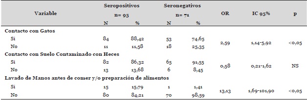 Las fuentes de contaminación por T. gondii son múltiples (carne, agua, tierra, verduras) y explican la adquisición a menudo precoz de la infección en el transcurso de la vida. Se encontró asociación estadísticamente significativa entre el contacto con gatos y la ocurrencia de la infección por T. gondii, 88,42% de los individuos seropositivos, manifestaron tener contacto con gatos; estos resultados concuerdan con los obtenidos en Argentina 14, Colombia 39, Brasil 36 y Estados Unidos 40. Esto puede deberse a la contaminación del peridomicilio, de las áreas de juego de los niños, con heces de gatos que contienen ooquistes del protozoo.