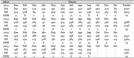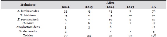 En el periodo evaluado, los helmintos detectados correspondieron a: A. lumbricoides, T. trichiura, E. vermicularis, H. nana, S. stercoralis y Ancylostomideos (Tabla 2). La mayor prevalencia de MPH en los años 2012 y 2013 correspondió a A. lumbricoides (33/70, 47,1% y 13/33, 39,4% respectivamente) mientras que en los años 2014 y 2015 lo fue T. trichiura (25/73, 34,2% y 10/22, 45,5%).