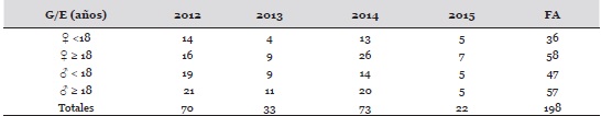 La distribución de la infección helmíntica por género y edad se muestra en la Tabla 3. Para el año 2012, la mayor prevalencia se obtuvo para el género masculino: 40/70 (57,1%), con mayor presentación en ≥ 18 años. En 2013 el comportamiento fue similar: mayor presentación de casos en hombres ≥ 18 años: 11/33 (33,3%). En 2014 la tendencia varió, al presentarse la mayor prevalencia de infección en mujeres ≥ 18 años: 26/73 (35,6%). El grupo de mujeres ≥ 18 años nuevamente resultó predominante en el 2015: 7/22 (31,8%).