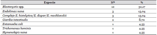 Entre los niños poliparasitados (n=5), la combinación más frecuente fue Endolimax nana-Blastocystis spp. (40%; n=2), seguida de Hymenolepis nana-Blastocystis spp. (20%; n=1), Complejo E. histolytica/E. dispar/E. moshkovskii-Giardia intestinalis (20%; n=1) y Complejo E. histolytica/E. dispar/E. moshkovskii-Blastocystis spp.-Entamoeba coli-Trichomonas hominis (20%; n=1). Aunque no se realizó un método específico para el recuento de Blastocystis, se observó que el 91,67% de los casos con dicho microorganismo (n=11) presentó un número superior a cinco (5) formas evolutivas por campo microscópico observado.
