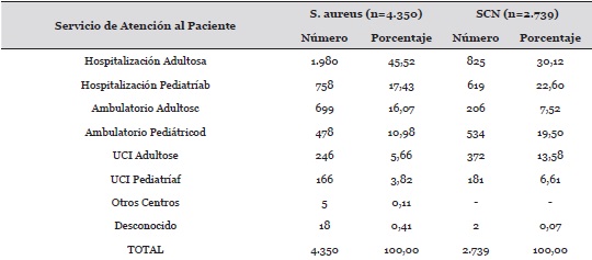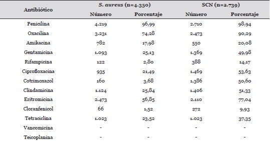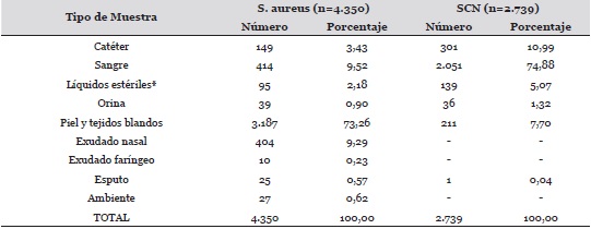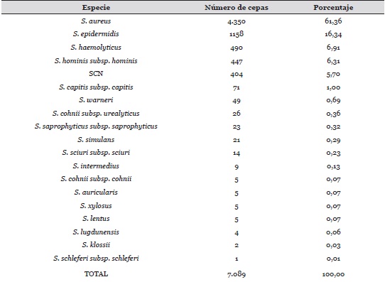Durante el periodo de estudio, se aislaron 7.089 cepas del género Staphylococcus; de las cuales 4.350 (61,36%) fueron identificadas como S. aureus y las 2.739 (38,64%) restantes fueron agrupadas como SCN.