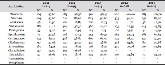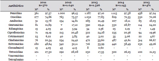 La Tabla 5 revela la resistencia antimicrobiana de S. aureus por año de estudio, encontrándose 97,57% como porcentaje máximo de resistencia a penicilina (2.011), seguido de 77,83% para oxacilina (2.013); 66,67% para clindamicina (2.015); 53,99% para eritromicina (2.103) y 29,41% para el resto de los antibióticos evaluados, a excepción de los glicopéptidos (vancomicina y teicoplanina) para los cuales no se observó la aparición de resistencia. Por su parte, para los SCN, la resistencia antimicrobiana por año se comunica en la Tabla 6, obteniéndose hasta un 100% de cepas resistentes a penicilina (2.015); 97,66% de resistencia a oxacilina (2.011); 84,11% de resistencia a eritromicina (2.011) y 65,90% de resistencia a cotrimoxazol (2.013). Para el resto de los antibióticos probados (sin incluir los glicopéptidos), el máximo de resistencia encontrada fue de 58,30% para gentamicina (2.012). No se observó resistencia a los glicopéptidos entre las cepas de este grupo. Cabe destacar que no se encontró diferencia estadísticamente significativa entre los porcentajes de resistencia antimicrobiana de los aislamientos de estafilococos entre 2011 y 2015 (p>0,05).