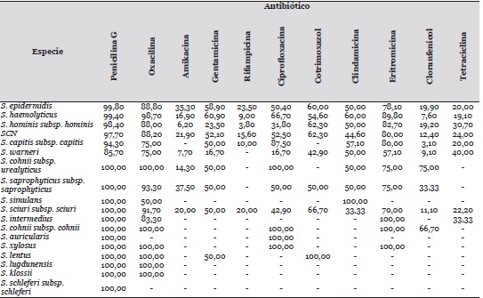 De las 17 especies coagulasa negativa identificadas y el grupo de cepas reportadas simplemente como SCN, casi todas las cepas se mostraron multi-resistentes (MDR, expresaron resistencia a 3 o más familias de antibióticos), a excepción de los aislamientos de S. auricularis y S. klossi que expresaron resistencia a 2 grupos de antibióticos y S. schleferi subsp. schleferi que fue resistente sólo a penicilina G (Tabla 7).