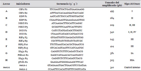 la tipificación del complejo SSCmec y sus variantes se realizó mediante la PCR múltiple e incluyó la amplificación de 8 locus diferentes (A hasta H), según lo descrito por Oliveira y De Lencastre 21. Se incluyó un control positivo con el gen mecA. La relación de cada locus con el tipo de SSCmec, los iniciadores utilizados y el tamaño del amplicón están descritos en la Tabla 2. Los datos obtenidos en este estudio fueron analizados en forma porcentual, y organizados en tablas y/o gráficos. Para establecer si existe asociación entre la producción de PVL y el tipo de SSCmec de las cepas SARM, se aplicó el estadístico c2 con un grado de confiabilidad del 95%. Se empleó el Software estadístico SPSS (Statistical Package for Social Sciences), versión 21.