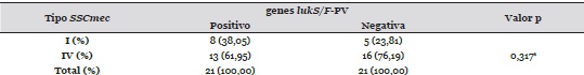 Los genes lukS/F-PV fueron detectados en una investigación anterior, realizada en un hospital universitario de esta ciudad donde se encontraron 21 cepas positivas (50,00%) para estos genes 22. La relación entre la presencia de estos genes con el tipo de SSCmec se presenta en la Tabla 3. Trece cepas 13 (61,95%) presentaron cassette cromosómico tipo IV y 8 (38,05%) SCCmec tipo I (Figura 3).