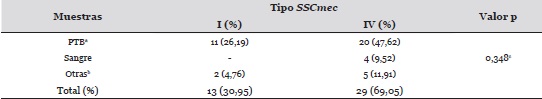La correlación entre el tipo de muestra y la distribución de los tipos de SSCmec, no arrojaron diferencias estadísticamente significativas, observándose aislamientos con el cassette cromosómico tipo IV con mayor frecuencia en muestras de piel y tejido blando (47,62%).