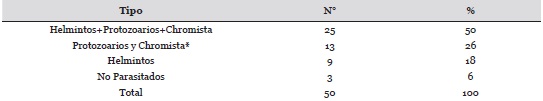 La Tabla 1 revela los resultados obtenidos en forma general. La prevalencia de parasitados fue de 94%, representada por 47 individuos; Blastocystis spp. (chromista) y los protozoarios alcanzaron un 26% mientras que los helmintos 18%, obteniéndose un 50% de individuos afectados por todos los tipos de parásitos.