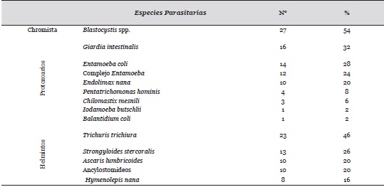 En la Tabla 2 se observan las especies parasitarias identificadas en el estudio, ocupando el primer lugar Blastocystis spp. con 54% (chromista); dentro de los protozoarios, G. intestinalis y el complejo Entamoeba, se ubicaron respectivamente en el primer (32%) y tercer lugar (24%). Así mismo, para los helmintos, el primer lugar lo obtuvo T. trichiura con un 46%, seguido por S. stercoralis con un 26%.