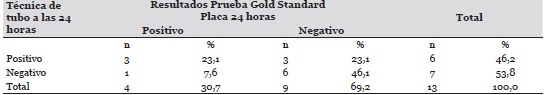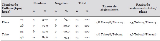 En la Tabla 4, respecto a la técnica difásica en tubo, 6 pruebas resultaron positivas a las 24 horas (46,2%) y 4 (30,7%) mediante la técnica de agar en placa; es decir, que se observó un 1 falso negativo (7,6%) a través de la metodología