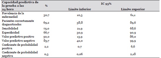 La sensibilidad o verdaderos positivos respecto al total de positivos, muestra igualmente en la metodología probada (TDT) un porcentaje importante de detección de la especie de 75%, con amplios intervalos de confianza (21,9 IC inferior y 68,6 IC superior) a las 24 horas, con 85,71% de recuperación de la misma con intervalos de confianza que disminuyen (42,01 IC inferior y 99,25 IC superior) a las 48 horas. Así mismo, la especificidad y valor predictivo negativo de la prueba decrecen a las 48 horas. De tal manera, la primera es de 66,7 a las 24 frente a 16,67 a las 48, mientras el segundo muestra un resultado de 85,7 a las 24 horas en contraposición a 50,0 a las 48.