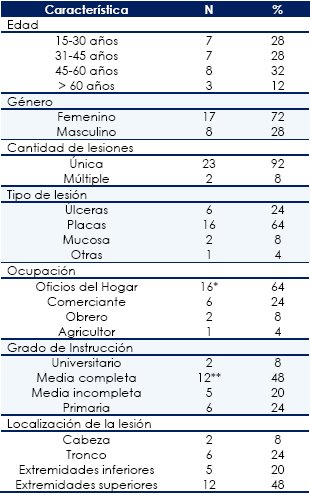 De los 25 individuos evaluados, 18 (72%) fueron del género femenino y 7 (28%) del masculino. La edad osciló entre 21 y 68 años, con una media de 42,6 y una desviación estándar de 14,31 años. El mayor grupo fue el de 45 a 60 años (32%) Del total de personas evaluadas se detectaron 23 (92%) con lesión única y 2 (8%) con lesión múltiple. Por su parte los tipos de lesión estuvieron distribuidas 16 (64%) placa, 6 úlceras (24%) y 2 mucosa (8%); localizadas 2 (8%) en cabeza, 6 (24%) en tronco, 5 (20%) en extremidades inferiores y la mayor cantidad estuvo presentada en extremidades superiores 12 (48%).
