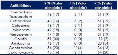 se utilizó el método de difusión en disco, siguiendo los lineamientos de la tabla 2B-1 del Manual M100-S26. Se emplearon los discos de: piperacilina-tazobactam (100/10 µg), ceftazidime (30 µg), cefepime (30 µg), imipenem (10 µg), meropenem (10 µg), ciprofloxacina (5 µg), colistin (10 µg), gentamicina (10 µg) y amikacina (30 µg). Se usaron E. coli ATCC 25922 y P. aeruginosa ATCC 27853, como cepas controles 22.