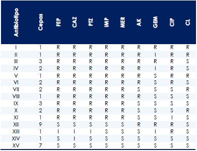Los antibiotipos XII y XV fueron los más representativos en este estudio (Tabla 2), siendo el XII el de las cepas AmpC positivas. Las cepas aisladas de pacientes de las camas 4 y 10, pertenecen a este antibiotipo (datos no presentados). Dos cepas aisladas de los pacientes atendidos en el SAO están relacionadas entre sí, lo que hace un total de 6 cepas del antibiotipo XII en diferentes sitios (datos no presentados).