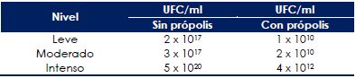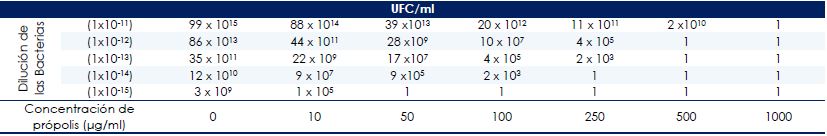 En la cepa 6D9, de producción leve de biopelícula, disminuyó la población bacteriana de 1014 a 1011 UFC/ml con 10 μg/ml de própolis; con concentraciones mucho más altas (50 a 1000 μg/ml), se logró inhibir la producción casi por completo (1 UFC/ml). La cepa 6F7, de producción intensa, también se inhibió con própolis a todas las concentraciones (Tabla 3).