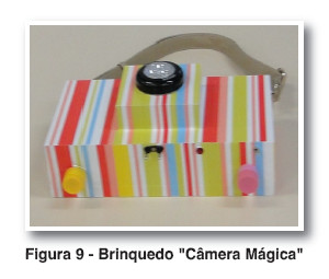 Brinquedo "Câmera Mágica" (Figura 9): trata-se de uma câmera fotográfica feita com material reciclável, que tem por objetivo preparar a criança para o procedimento de raios-x. A câmera possui uma lanterna com diodo emissor de luz (ou luz de LED - Light Emitting Diode), acoplado em sua face anterior, que acende ao ser apertado um botão, localizado na sua parte superior. No lado posterior, possui recortes de raios-x pediátricos (mãos, tórax e crânio) unidos a um pedaço de madeira e a uma tampinha de garrafa de politereftalato de etileno (PET), num circuito giratório. Ao girar a tampa, a criança tem acesso às imagens de raios-x. Para a sua aplicação, o profissional simula a realização de fotos da criança, exatamente das regiões similares às que o brinquedo apresenta nas lâminas de raios-x. Além disso, deve estimular a criança a manusear o brinquedo e a tirar fotos do profissional ou do familiar. Posteriormente à brincadeira, mostra as imagens fictícias à criança, promovendo um momento de recreação e catarse. Em seguida, a convida para continuar a brincar com uma máquina fotográfica muito maior, a de raios-x, realizando o exame necessário. O brinquedo pode ser aplicado para crianças de até 10 anos. O tempo de aplicação é variável (média de 40 minutos).